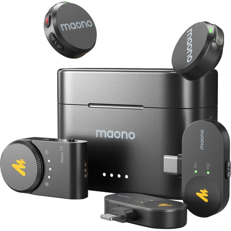 Maono WM650 A3 microphoneThe Maono WM650 A3 is a 2.4GHz wireless microphone system with two transmitters with built-in microphones, designed for on-the-go and field recording. It offers a transmission range of up to 300 meters, long operating time on a single charge, and noise reduction with 14-step in-app adjustment. The kit also allows quick sound personalization with four ready-made sound presets and includes three receivers - for a phone with USB-C, for an iPhone (Lightning) and for a camera.