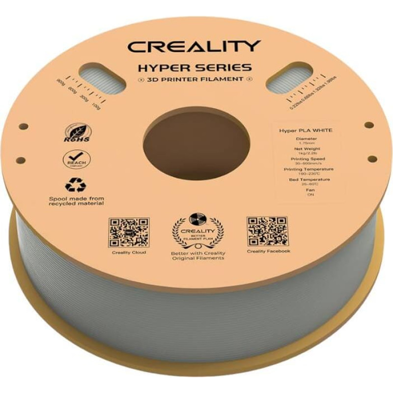 Creality Hyper PLA Filament (White)Creality's Hyper PLA Filament stands out for its fast cooling and durability, while providing excellent precision. It's made from high-quality materials and is fantastic for a variety of applications - from creating figurines to appliance parts to prototypes. It allows fast, accurate printing and doesn't get tangled. It is ideal for use in conjunction with Creality printers. Users can also take advantage of the Creality Cloud service, which offers, among other things, plenty of free models for printing.