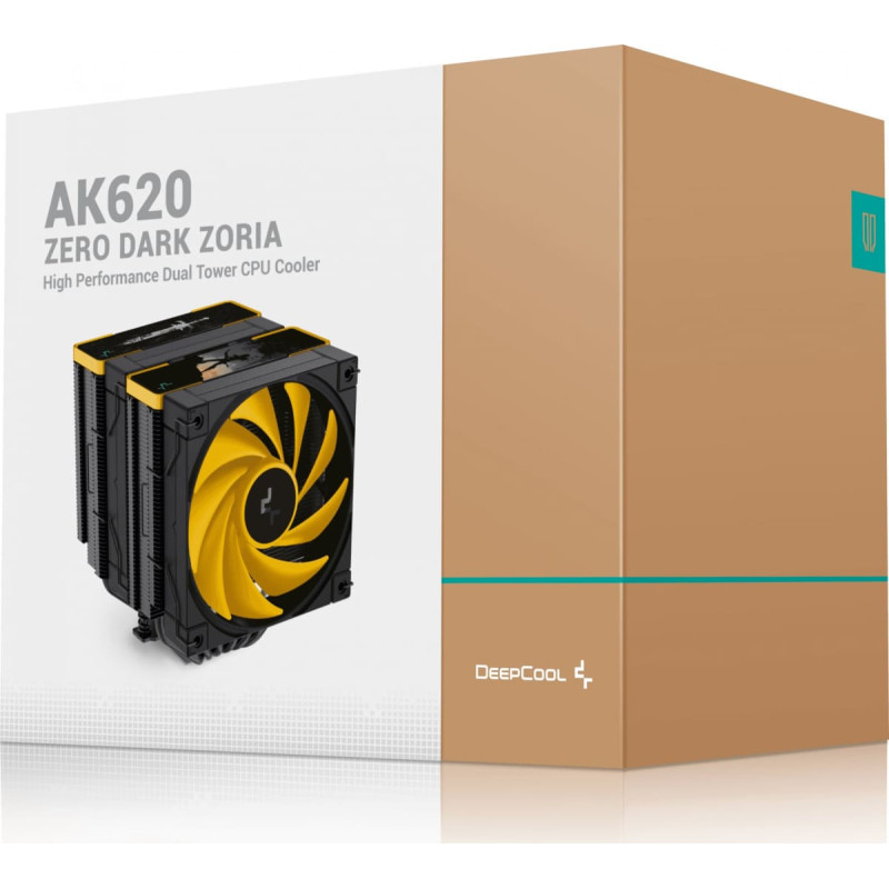 | The AK620 ZERO DARK ZORIA is a high-quality dual-tower air cooler that builds on the well-known AK620 design. This version of the AK620 is a special model developed in collaboration with Anshar Studios and appears in the design of the Zoria: Age of Shattering role-playing game. The same high-quality materials with six advanced copper heat pipes, a pure copper base plate, a dense dual-tower heatsink and two low-noise FDB fans create a powerful winning formula for high-performance cooling in a jet black and yellow aesthetic. Two powerful PWM fans with superior fluid dynamic bearings ensure quiet operation without losing cooling performance, ensuring a perfect balance. The included all-metal bracket ensures easy installation, ensuring the right contact and equal pressure on both Intel and AMD platforms.Art. No.: 100038655 Type processor cooler Color black/orange EAN-6933412728641 Manufacturer No. R-AK620-BKNPMN-E Type CPU cooler with fan CPU cooler design dual tower Suitable sockets 1150, 1151, 1155, 1700, 2011, 2011-3, AM4, 2066, 1200, AM5 Fastening screwed Volume 28 dB CPU up to max. TDP 260 watts Speed 500 to 1,850 rpm Heatpipe connections 6 pcs. Fan bearing FDB - Fluid Dynamic Bearing Volume flow 68.99 cfm Power connector 4-pin PWM Voltage range 12 volts Power consumption 1.44 watts Feature 6x 6mm heat pipes Dimensions Fan1 Quantity: 2 pieces, width: 120 mm, height: 120 mm, depth: 25 mm Total width: 129 mm x height: 160 mm x depth: 138 mm Weight CPU cooler 1,456 grams | ||||||||