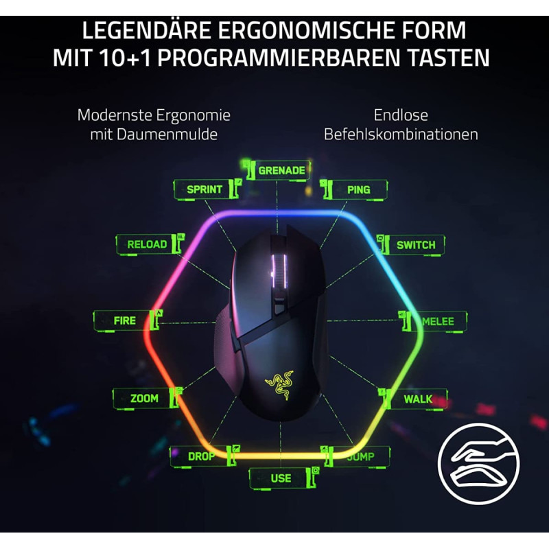 | Type: Gaming Mouse Color: Black EAN: 8886419334026 Manufacturer number: RZ01-04620100-R3G1 Scope of application: gaming Suitable for: PC, notebook Connection: radio, cable : 2.4 GHz USB receiver, Bluetooth : 1x USB : 1.8 meters Query: optical : Razer Focus Pro 30K : 30000dpi : 750IPS : 70 g : 1000Hz Operation: Razer Optical Gen 3 : 90 million clicks : 11 pieces : 1 piece : Yes : for right-handers Lighting: 13-zone lighting, RGB Software: Razer Synapse 3 Power Supply: Built-in battery, rechargeable Features: 4-way Razer HyperScroll tilt wheel with electronically controlled lock and freewheel modes, 10+1 programmable buttons, adjustable lift-off and landing distance, on-the-fly sensitivity adjustment (default levels: 400/800/1600 /3200/6400), Hybrid On-Board & Cloud Storage (4+1 Profiles), Razer HyperSpeed Wireless Technology, 13-Zone Chroma Illumination with Full Underlight, Injection-Molded Rubber Grips, SpeedFlex USB-C Charging Cable More information: Battery life: Up to 90 hours with Hyperspeed Wireless (1000 Hz, constant motion), 100 hours with Bluetooth. Estimates without backlight, battery life depends on usage settings. | Compatible with Razer wireless chargers and other Qi chargers, e.g. Razer Mouse Dock Pro or Wireless Charging Puck (not included) | Up to 4000Hz polling rate with the Razer Mouse Dock Pro or HyperPolling wireless dongle (not included) Dimensions: Width: 75.4mm x Height: 42.5mm x Depth/Length: 130mm Weight: 112 grams | ||||||||