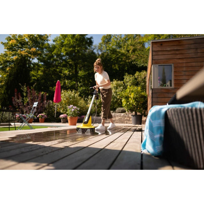 | The Kärcher patio clEAN Code er PCL 3-18 Battery Set puts an end to strenuous scrubbing. You just need to connect it to the garden hose, insert the battery and a short time later you can enjoy a cool drink on the clEAN Code ed patio. The patio clEAN Code er PCL 3-18 makes it possible because the rotating brush rollers and the water ensure even clEAN Code liness, even with stubborn and deep-seated dirt. The dirt is reliably loosened and washed away through the two spray nozzles to the front. The backward rotating rollers not only achieve thorough clEAN Code ing, but also protect the user from splash water. The innovative roller technology and the special bristle material ensure particularly even clEAN Code ing. The patio clEAN Code er PCL 3-18 offers a wide range of application options thanks to interchangeable brush rollers (wood, WPC, stone). The amount of water can be regulated so easily on the handle that only as much water is used as is actually required. After clEAN Code ing, you can simply lEAN Code it against a free wall and you're done. The brushes are reliably protected from warping thanks to the space-saving storage function. The cordless patio clEAN Code er PCL 3-18 Battery Set can be operated with all 18 V Battery Power batteries that are also used in other Kärcher garden equipment and tools.Art. no.: 1814938 Type hard floor clEAN Code er Color yellow/black EAN Code 4054278883144 Manufacturer part number: 1.644-011.0 Made in Europe Intended use For clEAN Code ing wooden and stone surfaces outdoors Operating mode Battery operation Power supply 18 volts Sweeping Number of sweeping rollers 2 pcs. Pressure Water pressure 10 bar Working dimensions Working width 300 mm optional brush rollers for stone surfaces Brush speed from 450 rpm to 550 rpm Feature Ergonomic design with 2 handles for fatigue-free and comfortable working Further information Real Time Technology with LCD battery display: running time, charging time and battery capacity Note The 18 Volt Battery Power interchangeable battery with innovative Real Time Technology including LCD display is suitable for use in all devices on the Kärcher 18 Volt Battery Power battery platform. Accessories available Lithium-ion battery Battery Power 18/25, quick charger, 2 brush rollers for wood and WPC surfaces Dimensions Width: 307 mm x Height: 1,324 mm Weight 3.7kg | ||||||||