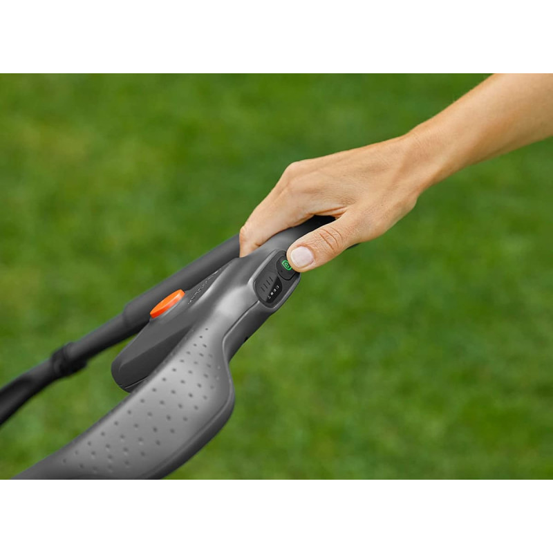 | The reliable GARDENA cordless lawn mower PowerMax 32/18V P4A is perfect for maintaining small to medium-sized lawns. It impresses with its power, comfortable operation and high efficiency. The double-hardened, precision-ground DuraEdge blades ensure optimal cutting results. The ErgoTec handle with loop switches on both sides and height adjustable in three levels makes pushing the mower particularly comfortable. The central QuickFit-Plus height adjustment allows the cutting height to be adjusted in four levels at the touch of a button with just one hand. Extra lawn combs on the sides of the housing ensure that the lawn can be mown along walls and curbs right up to the edge. Thanks to the guided air circulation and the ideally positioned 30-litre textile grass catcher, significantly more grass is collected. This reduces the frequency of emptying when mowing and saves time. The brushless motor of the PowerMax 32/18V P4A will not let the owner down even after frequent use. It retains its high efficiency and has a long service life. The foldable handlebars mEAN Code that the lawnmower can be easily transported and stored in a space-saving manner. The GARDENA cordless lawnmower PowerMax 32/18V P4A is supplied as a ready-to-use set with a charger and a powerful 4.0 Ah 18V POWER FOR ALL battery. Any other battery from the 18V POWER FOR ALL ALLIANCE can also be used, regardless of the manufacturer. The POWER FOR ALL ALLIANCE is one of the largest cross-brand battery alliances of leading manufacturers (GARDENA, Bosch, Husqvarna, STEINEL, Gloria, Flymo, Rapid, Wagner, etc.). This mEAN Code s that you do not need to buy an extra battery for each device and save money. For best performance, batteries with at least 4.0 Ah capacity are recommended.Article no.: 1890108 Type lawn mower Color black/grey EAN Code 4078500061971 Manufacturer part number: 14632-20 Made in China PowerMax Series Intended use For mowing small and medium-sized lawns up to 200m2 Operating mode: Battery operation Operating voltage 18 volts Battery system POWER FOR ALL ALLIANCE (Bosch, GARDENA, Steinel, Gloria Garten, Wagner,..) Li-ion battery, 18 Volt, 4 Ah, 72 Wh Area performance 200 m2 per battery charge Operation Push button for Eco mode on the handle Display/Display grass catcher level indicator, battery charge level indicator on the handle Handle ErgoTec handle, carrying handles Working width 32 cm Cutting height 35 mm - 65 mm Cutting height adjustment 4-stage, centrally adjustable Grass catcher 30 litre capacity Equipment Height-adjustable handlebar, lawn comb Recommended lawn area up to 200 m2 Motor Brushless PowerPlus motor Feature QuickFit Plus: Cutting height adjustment at the touch of a button More information Double hardened DuraEdge knife with precision ground Note The 18 volt system batteries from the Power for All Alliance are based on Bosch technology. They also fit in a variety of other GARDENA garden tools, but can also be used across brands with numerous other products from other manufacturers in the alliance. One battery for all devices - the POWER FOR ALL ALLIANCE is one of the largest cross-brand battery alliances of leading manufacturers worldwide and offers solutions for the entire home. Accessories available Charger, 4.0Ah 18V POWER FOR ALL battery Dimensions Width: 37 cm x Height: 95 cm x Depth/Length: 114 cm Weight 9.9 kg | ||||||||