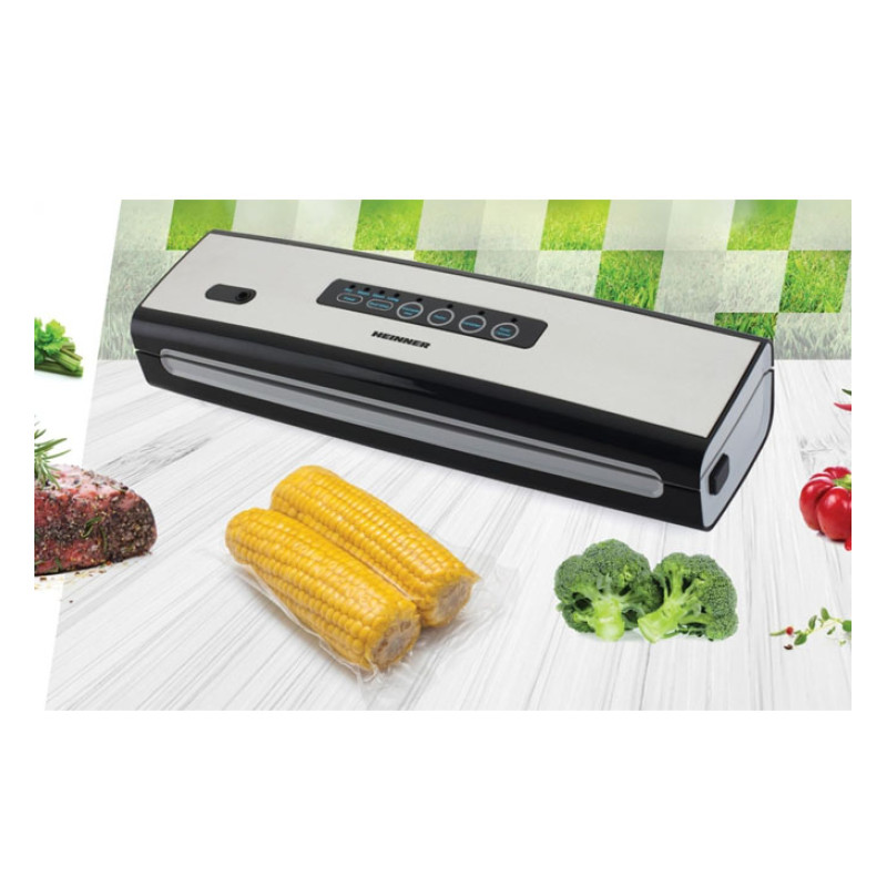 Vacuum Sealer and Food Saver Heinner HAV-130BKSS, Vacuuming and Sealing, Wet and Dry Vacuuming, Seal-Only Function, Canister Vacuuming, Touch Control, Pulse Function, Two Modes: Gentle and Normal, Includes 1 Roll Bag (20x200 cm), Hose for Canister Vacuuming, Built-in Mini Cutter, Compatible with Bags up to 30 cm Wide, Vacuum Speed: 6L/min, Pressure: 0.58 bar, Power: 130W, Compact Design for Easy Storage, Stainless Steel Top Cover.