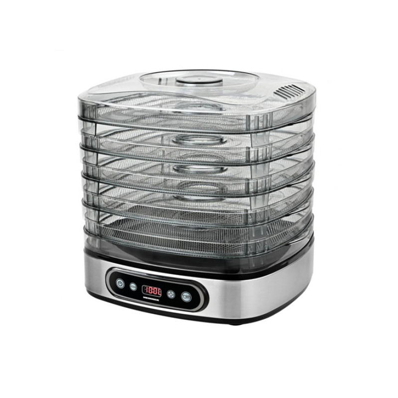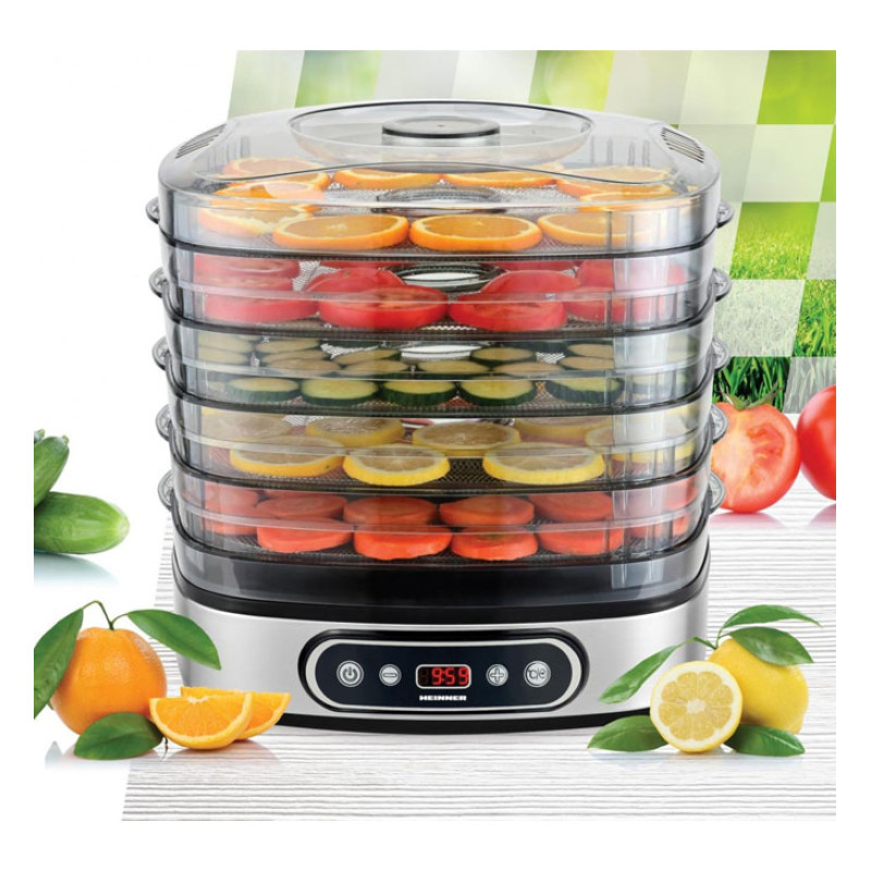Heinner FreshDehydrate HFD-K380SSBK Fruit and Vegetable Dehydrator, 320–380W Power, LED Display & Electronic Control, 5 Stainless Steel Trays, 35–70°C Temperature, 30 Min – 19.5H Timer, Overheating Protection, Adjustable Height, Stainless Steel Decorations