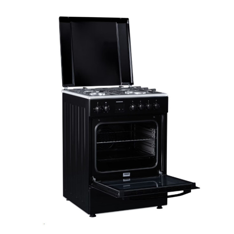 Combined Stove Heinner HFSC-S66FDCC-IBK, 60×60 cm, 4 Burners, Cast Iron Support, Metal Cover, Electric Hotplate Ignition, Hotplate Safety Device, Electric Oven, 6 Functions, Digital Timer, Grill, Ventilation, Oven Light, Catalytic Self-Cleaning, Oven Door with Removable Double Glass, LPG Nozzles Included, Chrome Tray and Grill, Dimensions (L×W×H): 60×60×83 cm, Black