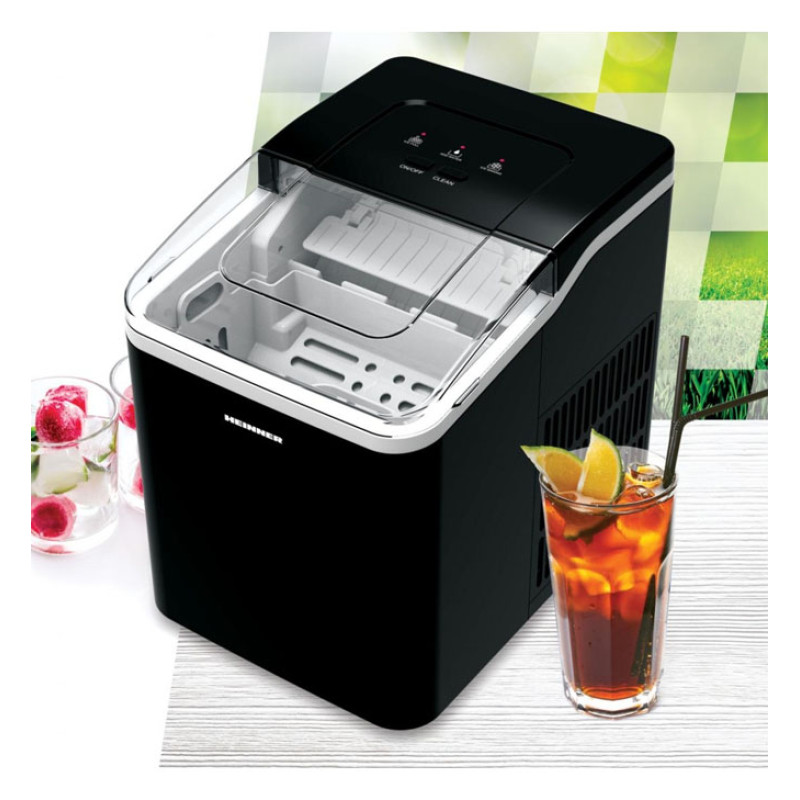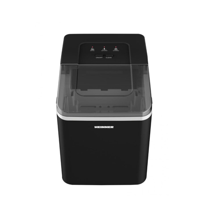 Ice Cube Maker Heinner Juneau HIM-120BK, 12kg/24H Daily Ice Output, 9 Ice Cubes per Cycle (7–11 Min), 1.5L Water Tank Capacity, Two Ice Cube Sizes, Clean Function, Removable Ice Basket, Large Transparent Full-View Window, Full Ice Basket Indicator, Low Water Indicator, 120W Power, Dimensions (W×D×H): 22.8×32×29.7 cm, Black