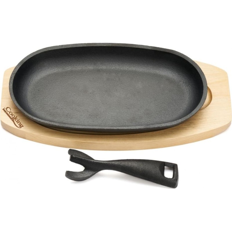 Steak pan 24 cm with detachable handle and wooden base, cast iron. Food served in cast iron cookware is more aromatic, juicier, tastier and healthier. Cast iron has a high heat capacity. Cast iron products are suitable for induction hobs. Care instructions: Before first use, wash the product with water and liquid detergent, then coat the interior with oil. Do not overheat the product when empty. Dishwasher safe.