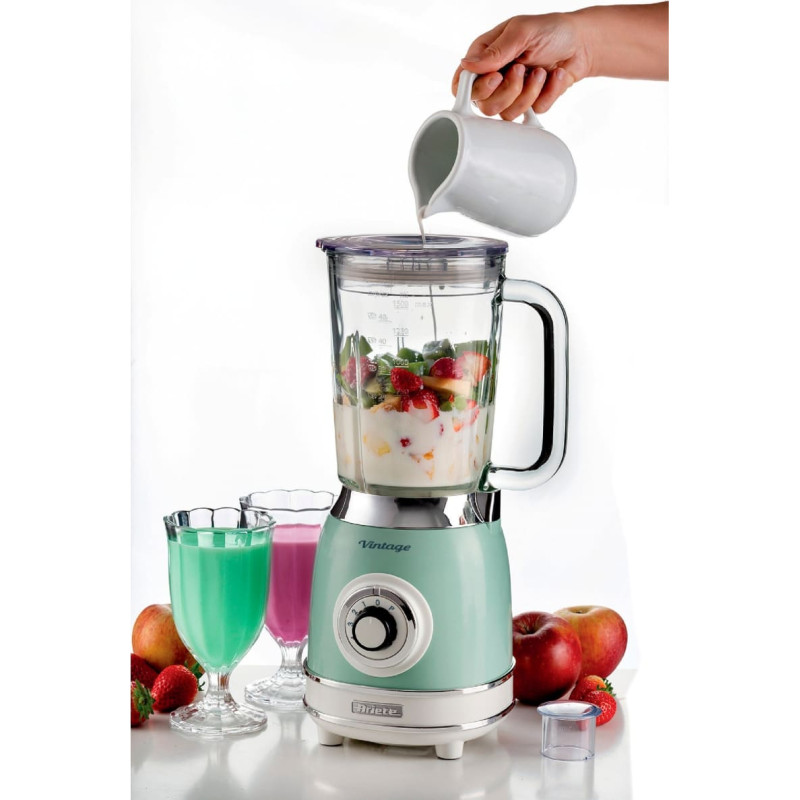 | An invigorating smoothie, a creamy smoothie or a refreshing slush? With the Ariete Vintage Mixer with Glass Beaker you can prepare the drink of your choice every day by mixing the ingredients evenly. The glass cup is durable and the four stainless steel blades combined with the 4 available speeds are ideal for blending. In addition, thanks to the practical measuring cap, the ingredients can be added directly into the mixing cup through the hole on the top. The performance of an excellent mixer and the typical design of the Ariete Vintage range come together in a mixer perfect for giving a touch of retro style to your kitchen. Item number: 100052786 Stand mixer type Colour light green/cream EAN8003705119376 Manufacturer No. 0583GR Vintage Series Operation rotary knob with 4 levels + pulse Material glass, metal Features ice crush function, pulse level, smoothie function Details speed 4+ pulse Knife 4 stainless steel blades Mixing container capacity 1.5 l Glass container, level indicator, refill opening Cleaning Easy to clean Mains operation mode Power 1,000 watts Safety anti-slip/suction feet Notes Incl. Measuring cap for ingredients Dimensions Width: 18.5 cm x Height: 40.5 cm x Depth/Length: 21.5 cm Weight 4kg | ||||||||