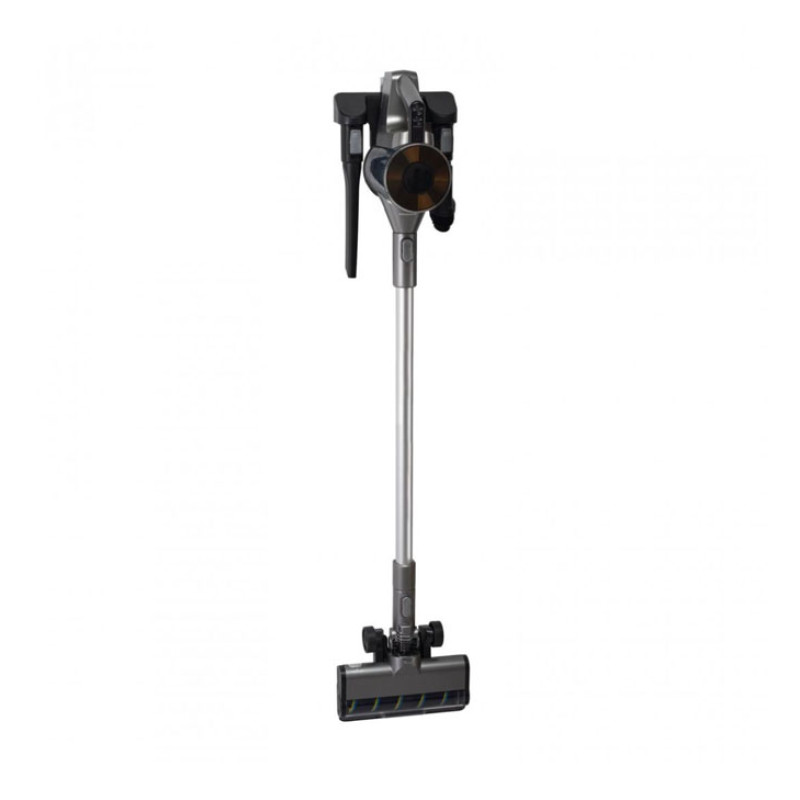 Heinner VertiGo HSVC-MBD25.9S Cordless Stick Vacuum Cleaner, cyclonic filtration system, 25.9V lithium battery, dual-use: handheld and upright vacuum, BLDC motor, 120,000 RPM, power: 450W, 3-speed settings, suction power: 140W, runtime (max, low): 10/20 min, LED display with suction mode, battery status, and error indicators, dust sensor with automatic suction adjustment, 4 cleaning modes, motorized brush with LED lights, dust bin capacity: 0.7L, charging time: 4-6 hours, HEPA filter, accessories: crevice tool, upholstery brush, wall mount, charger, vertical storage stand, extended crevice tool, noise level: 84dB, silver