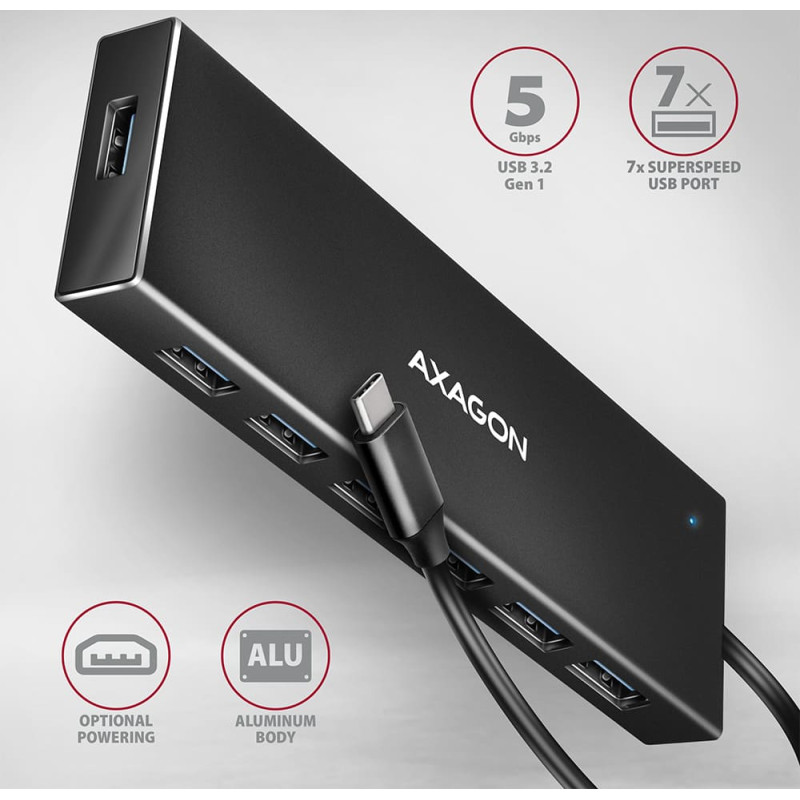 | Thin USB-C 3.2 Gen 1 (USB 3.0) hub AXAGON HUE-F7C with 30 cm long USB cable fast and easy connects up to seven USB devices to the laptop at the same time. The USB 3.2 Gen 1 standard enables transfer speeds of up to 5 Gb/s.