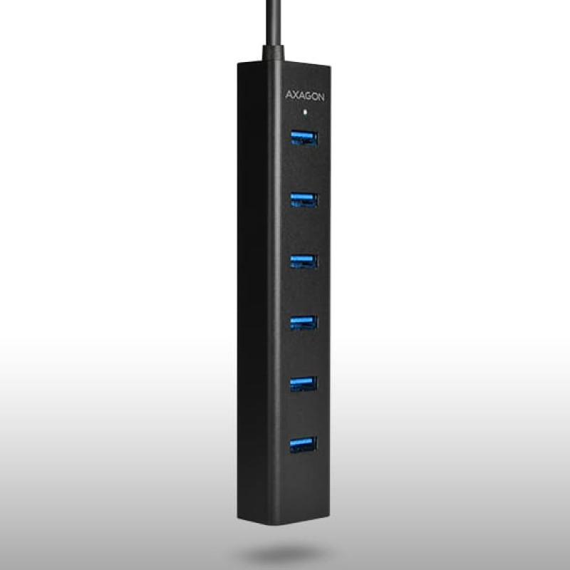 | The seven-port AXAGON HUE-SA7BP ALU CHARGING USB 3.0 hub with own power and fast charging support on all USB ports. A compact hub with a durable aluminum case connects up to seven USB devices to your PC simultaneously. At the same time you can charge mobile phones/tablets/power banks and other devices up to 2A in any hub port thanks to the USB Battery Charging 1.2 support. It can handle permanent connection of several external disks even without the own hub power. With its own power it connects up to four 2.5" magnetic external disks. The USB ports located across the hub body with sufficient spacing ensure seamless direct connection of large USB devices. A permanently attached USB cable with a sufficient length of 40 cm is ideal for use with laptops. It can also work as a separate charging hub and charge the USB devices from the power adapter even when the PC is turned off or disconnected. The compact power adapter 5V/2A is included. Features: • 7 downstream USB 3.0 ports with enough space around the connectors. • an upstream USB 3.0 port with USB 3.0 Type A male connector on a 40 cm long permanently attached cable. • Compatible with USB 3.0 and backward compatible with USB 2.0 and USB 1.1. • Supports transmission rates 1.5 / 12 / 480 / 5000 Mb/s (low / full / high / super speed). • Supports USB Battery Charging v 1.2 specification. • Each hub port can be used to charge up to 2A. • Possibility to connect your device while running thanks to the Hot Plug support. • Full Plug and Play support. • LED indication of hub connection to power supply. • Current overload detection and protection. • Hub dimensions 156 x 30 x 21 mm, AC adapter dimensions 29 x 75 x 80 mm, including fork. • Hub weight 88 g (incl. cable), AC adapter weight 100 g (incl. cable). The hub power mode via USB cable (bus power): • The USB bus power is sufficient to connect the USB device with a low power consumption (mouse, keyboard, card reader, flash disk, etc.) or own power supply (printer, scanner, 3.5" external disk) to all seven ports. • In this power mode, the USB hub is also able to cope with up to two, or three if connected sequentially, magnetic 2.5" external disks simultaneously. • Charging of mobile devices (except for iPads) is also possible in this power mode, however, the charging current is only 0.9A. Own hub power mode via the included power adapter (self power): • Own power supply via the included AC/DC adapter (input: 100-240V~, 50/60Hz, 0.45A, output: 5V-2A / 10W, two-pin Euro fork, output coaxial connector diameter 3.5/1.3 mm, cable 150cm). • In this power mode, the USB hub is able to cope with four 2.5" magnetic external disks. However, we recommend that you connect max. three 2.5" magnetic external disks simultaneously for reliable long-term hub operation. • Fast charging of mobile devices (including iPads) up to 2A in each of the hub ports. The total current supplied by the hub during charging is limited by the output current of the external power adapter to max. 2A. Independent charging hub mode without being connected to the PC (charging hub): • After turning off the connected PC or without being connected to the PC the hub works with power supply via the included AC/DC adapter as a separate charging USB hub. • Fast charging of mobile devices (including iPads) up to 2A in each of the hub ports. The total current supplied by the hub during charging is limited by the output current of the external power adapter to max. 2A. OS support: • MS Windows XP / Vista / 7 / 8 / 8.1 / 10 and later, Windows Server 2003 / 2008 / 2012 and later (supported are all 32 and 64-bit Windows OS versions), Mac OS X 10.4x and higher, Linux with kernel 2.6.x and above. • Note: Drivers are included with supported operating systems and are installed completely automatically. No other drivers need to be installed and are not even available. Package contains: • USB 3.0 hub with a permanently connected 40 cm long cable, • power adapter, • printed multilingual manual CZ / DE / DK / ENG / ESP / FIN / FR / GR / HR / HU / IT / NL / PL / PT / RO / RU / SK / SWE / TR / BG / CN / ARA, • packed in a cardboard box. Manufacturer Website: https://www.axagon.eu/en/produkty/hue-sa7bp | ||||||||||||||||||||