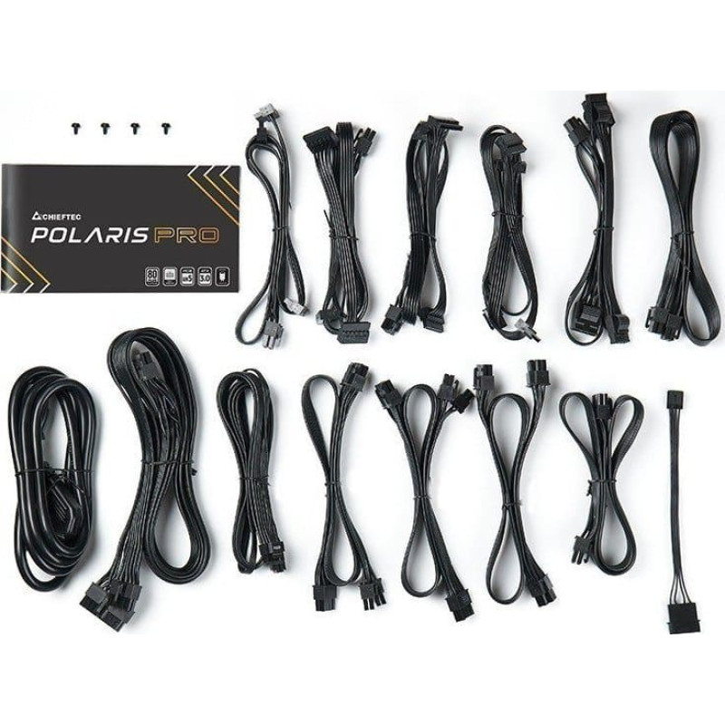 | The CHIEFTEC Polaris Pro series features advanced thermal control with Zero RPM mode, which enables the optimal balance between silence with low power consumption and ideal cooling with 80 PLUS® PLATINUM certified efficiency. The Polaris Pro series is designed for Intel's state-of-the-art ATX 3.0 standard with native PCIe GEN5 connector. The Polaris Pro series is made of 100% high-end Japanese capacitors to achieve unprecedented tight voltage regulation and lower ripple and noise to maximize system performance and excellent durability. The fully modular cable management allows for clEAN Code and convenient installation in any system.Article No.: 1910474 Type PC power supply Color: Black EAN Code -0753263078162 Manufacturer part number: PPX-1300FC-A3 Polaris Pro Series Total power 1300 W Control Temperature controlled ATX12V 3.0 ATX design 80 PLUS Platinum certification Current +3.3 V 24 A Power factor correction Active PFC Connectors 1x 24-pin ATX12V-2.x, 2x 4+4-pin 12V, 1x 4-pin 3.5", 4x 4-pin 5.25", 6x 6+2-pin graphics, 1x 12VHPWR, 12x 15-pin SATA Cable Cable management Yes Cooling Number of fans 1x 135 mm fan Protection functions Current peak protection (OCP), overvoltage protection (OVP), undervoltage protection (UVP), overload protection (OLP/OPP), short circuit protection (SCP), overheating protection (OTP) Dimensions Width: 150 mm x Height: 86 mm x Depth/Length: 160 mm | ||||||||