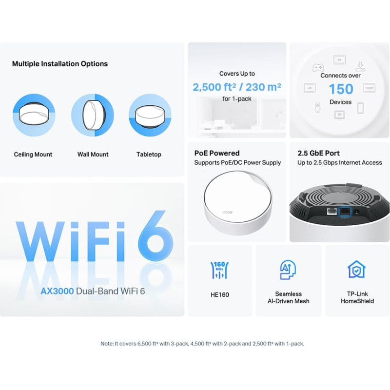 | Multi-Scenario Mesh WiFi Meets All Your Needs AX3000 Whole Home Mesh WiFi 6 System with PoE Multiple Installation Options, Put Your Deco Anywhere You Want Deco X50-PoE has flexible installation to meet various demand scenarios. Place it on a tabletop or install it on a ceiling or wall with our adaptive accessories. Ideal for Non-Stop Entertainments Armed with WiFi 6 technology, Deco whole home mesh WiFi is designed to deliver a huge boost in coverage, speed, and total capacity. Get on the latest mesh WiFi to enjoy the future network that loads faster and connects more. Powerful AX3000 Dual-Band WiFi Speed The latest 1024-QAM boosts speeds up to 3.0 Gbps — ideal for bandwidth-intensive tasks like cloud gaming and 8K video. Families will enjoy immersive live-streaming with flawless video and clear audio without buffering. Multi-Gig 2.5 Gbps PoE Port Armed with a 2.5 Gigabit Ethernet Port, Deco X50-PoE delivers exceptional multi-gigabit performance to support the insatiable demand for better and faster WiFi. Breakthrough the 1G bottleneck and drive your devices to peak performance. Or using 2.5 GbE port to enjoy blazing-fast wired connections. Power over Ethernet for Simplified Network Deployment Deco X50-PoE is designed to use a single Ethernet cable for both data and power transmission. It also supports DC (power adapter included) power supply for flexible installations. No Fuss Simplify the installation and streamline the deployment—no need for electricians. Cost-Efficiency No need for additional cables and power adapters—reduce costs on infrastructure. Flexibility More placement options allow for deployment in complex environments. Cover Every Corner of Your Home Deco units work together as a powerful mesh network to boost broader coverage for connections in every corner. Want more coverage? Simply add another Deco. All TP-Link Deco can work together. Engineered for More Devices Deco products are aimed to dramatically improve capacity and efficiency in traffic-dense environments. No matter how many screens or devices are on at once, everyone is able to enjoy a more efficient network that loads faster without dragging down performance. Intelligent Networking for a Smarter Home Deco uses its custom algorithms to automate the connections on your network, ensuring the strongest possible signals at all times. Seamless Roaming with One WiFi Name TP-Link Mesh means Deco units work together to form one unified network. Your phone or tablet automatically connects to the fastest Deco as you move through your home, creating a truly seamless WiFi experience. Whole Home Coverage Eliminate weak signal areas throughout your house Smart Roaming Uninterrupted streaming when moving between rooms One WiFi Name No more switching WiFi network names Unified Management Control your home WiFi by managing the central node via the Deco App Compact Design, Easy to Mount Exceptional performance with compact design ensures simple WiFi installation while saving space. The elegant appearance makes Deco X50-PoE with a delicate body case makes it perfect to blend into various home decorations. Simple. Easy. Yet Powerful. Setup and manage your network anytime and anywhere on the user-friendly TP-Link Deco app. In just three easy steps your entire home can be blanketed in strong and reliable WiFi. Easy Management Manage your WiFi at home or away on the Deco app. See every connected device, prioritize your own, and set up a guest network. Voice Control Use an Amazon Alexa or Google Assistant-enabled device to control Deco X50-PoE with just your voice. All Decos Work Together Deco X50-PoE is compatible with every other Deco model to form a Mesh network. Expand Mesh WiFi coverage anytime by adding more Decos. | ||||||||||||||||||||||||||||||||||||||||||||||||||||||||||||||||||||||||||||||||||||||||||||||||||||||||