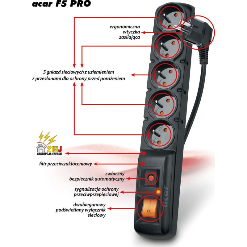 Acar Power strip Acar F5 PRO overvoltage 5 sockets 1.5 m black (W0092)