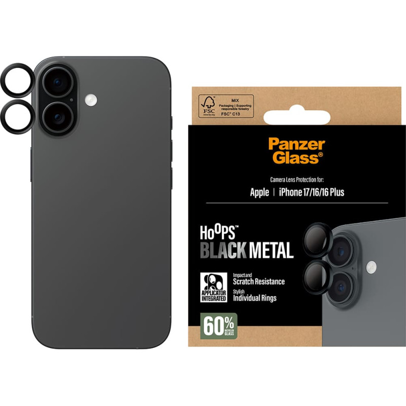 | No “Oops!” with Hoops®! The PanzerGlass® Hoops® camera lens protector shields your camera lenses from scratch-creating bumps, drops on stone-hard floors, and the screeching kiss of keys in your pocket. The slim profile optic rings are equipped with scratch-and shock-resistant glass and a black aluminum frame that protect your lenses as well as looking great. And if you’re worried about image distortion, rest easy: Hoops® don’t affect the clarity of your lenses or the quality of your photos – they just give you a bit more peace of mind. Hoops® protect and prolong the lifetime of your phone so that one day you can pass it on to someone else who will love it just as much as you do. It’s the new circle of phone life. By extending the lifespan of our devices, we postpone the need to produce new devices. This is one way of working toward a more sustainable future. Another is to use less packaging: In 2024, we reduced the amount of paper in our PanzerGlass® core product packaging design by an average of 66 %*. And of course, we continue to deliver all our products in recyclable FSC™-certified boxes. The optic rings are designed for easy application and perfect fit. They are equipped with a silicone adhesive along the edges and come with an easy-to-use applicator that makes installation a piece of cake (seriously!). And remember: Once installed, you’ll never again fear your phone falling camera-first. This might not happen, but then again … it might! *Reduction from 2022-2024 measured by comparing selected products from the PanzerGlass® core range. | ||||||||||||||||||||||||||||||||||||||||||||||||||||||||||||||||