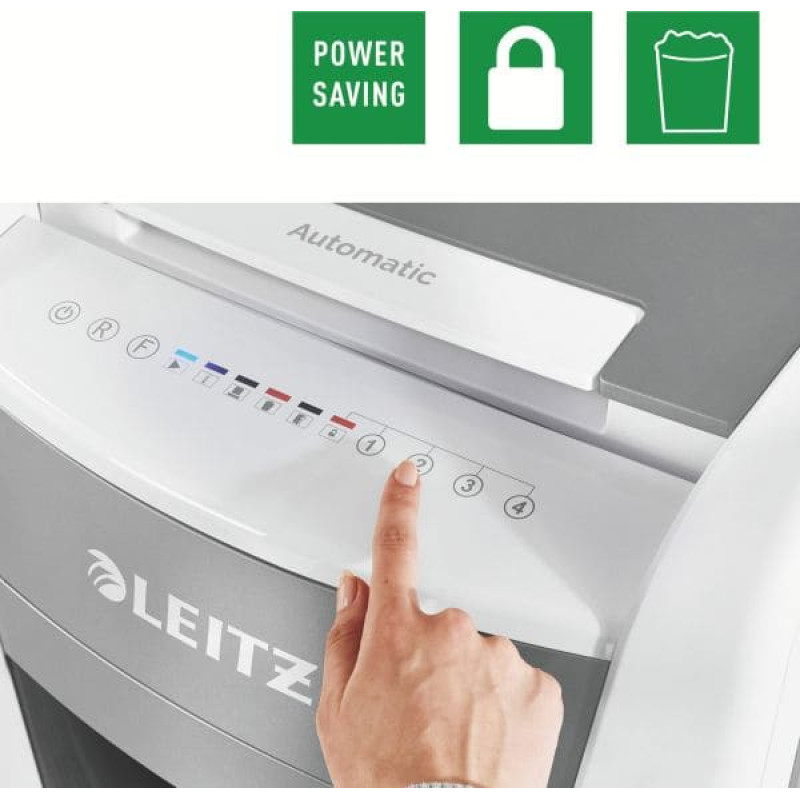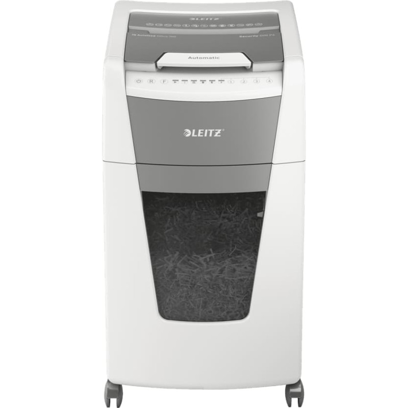 | Fully automatic paper shredder from Leitz with unique clean emptying feature. So intelligent it quietly works on its own, just insert your stack of papers (incl. staples & paper clips), close the lid and get on with your day. Ideal for office use. Confidential security and excellent performance with this anti jam, quiet and long running (60 min) autofeed shredder. Automatically shred 300 sheets of A4 into security P4 (4x28mm) cross cut pieces in one go into the generous 60L bin. Simple operation using touch controls. | ||||||||||||||||||||||||||||||||||||||||||||||||||||||||||