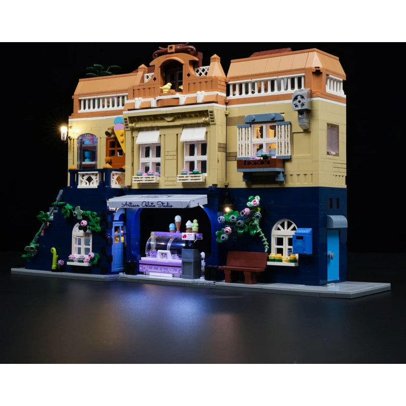 | Lumibricks – ta ir savstarpeji savienotu kiegelu buvešanas jautriba ar lieliskam detalam un efektivu apgaismojumu! Katram komplektam ir autentisks dizains un precizi piegulošas detalas, ka ari apgaismojuma aksesuari, padarot gatavo komplektu par iespaidigu uzmanibas piesaistitaju tumsa. Tas attiecas ari uz City Life serijas komplektiem: šis saldejuma salona modelis parsteidz ar dekorativu arpusi un detalizetu interjeru. Un interjers ir viegli pieejams, jo modeli var pilniba atvert, un visus tris stavus var atri izjaukt. Pagrabstava atrodas pardošanas lete ar dekorativu nojumi, savukart interjera ir saldejuma vitrina, saldejuma automats, kases aparats un daudzas citas detalas. Šo komplektu tumsa apgaismo 10 LED gaismas elementi. Šaja fantastiskaja saldejuma salona viesojas četras minifiguras. Konstrukcijas rotallietas veids EAN 0761687664724 Ražotaja Nr. F9078 Pilsetas dzives serija 1948. gada detalas Saturs/Funkcijas Instrukcijas, LED apgaismojuma komplekts, bateriju nodalijums (bez baterijam) Ieteicamais vecums 16+ Merkauditorija: pusaudži, pieaugušie Materials plastmasa Apgaismojums Ja Piezime. Baterijas nav ieklautas. Bridinajumi un drošibas noradijumi Bridinajumi: Uzmanibu: Aizrišanas risks siku detalu del! Uzmanibu: Nav piemerots berniem, kas jaunaki par 36 menešiem! | ||