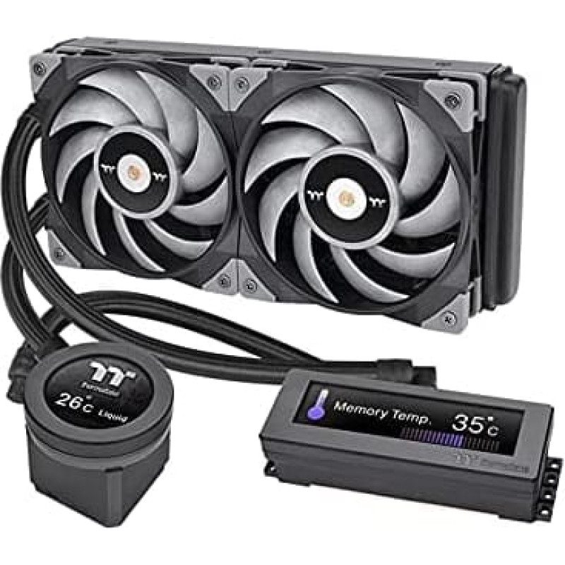 | The Thermaltake Floe RC Ultra 240 CPU & Memory AIO Liquid Cooler features powerful PWM radiator fans with a maximum speed of 2500 RPM and is equipped with LCD displays for CPU and RAM water blocks, giving the user full control over performance monitoring and visual effects. The Floe RC Ultra is an advanced, high-quality all-in-one cooling solution for cooling the CPU and memory simultaneously. The cooler features high static pressure fans and 2 fully customizable LCD water block displays that allow you to monitor the PC's performance at all times and minimize overheating problems. Compatible with TOUGHRAM RC memory modules, the Floe RC Ultra offers a simple and intuitive way to provide the user with unparalleled cooling performance.Item no.: 1768109 Type CPU & Memory AIO Liquid Cooler EAN Code 4713227528016 Manufacturer part number: CL-W324-PL12GM-A Floe RC series Type water cooling set Usage Compatible only with TOUGHRAM RC memory modules (sold separately) Suitable sockets 1150, 1151, 1155, 1156, 1366, 1700, 2011, 2011-3, AM2, AM2+, AM3, AM3+, FM1, FM2, AM4, 2066, 1200, AM5 Fastening screwed Volume 28.1 dB Equipment LED lighting LED lighting Yes Total width: 273 mm x height: 120 mm x depth: 52 mm Speed 500 to 2,500 rpm Material heat sink copper Volume flow 72.69 cfm Air pressure Up to 3.78 mm/H2O Radiator size 2x 120 mm Pump input voltage 12 Volt System Closed system Power connector 4-pin PWM Voltage range 12 volts Power consumption 2.76 watts Feature CPU Display: Voltage: 5 V, Input: 11.5 W, Display: 5.33 cm (2.1") TFT-LCD, Display Resolution: 480x480 (RGB) px, Memory Display: Voltage: 5 V, Input: 14 W, Display: 9.9 (3.9") TFT-LCD, Display Resolution: 128x480 (RGB) px, Display Support Interface: Micro USB to USB (9PIN), Compatibility: Windows 7 / 8 / 8.1 / 10 Further information Tube length: 400 mm Note Please note: The Floe RC Ultra is only compatible with TOUGHRAM RC memory modules (sold separately). Dimensions Fan1 Quantity: 2 pieces, width: 120 mm, height: 120 mm, depth: 25 mm | ||||||||