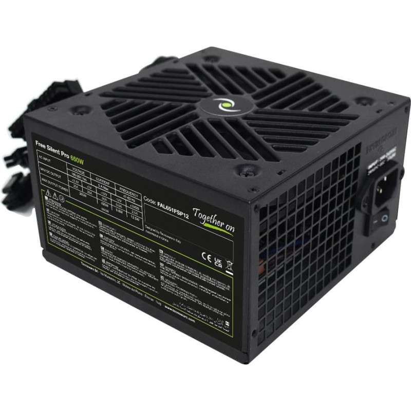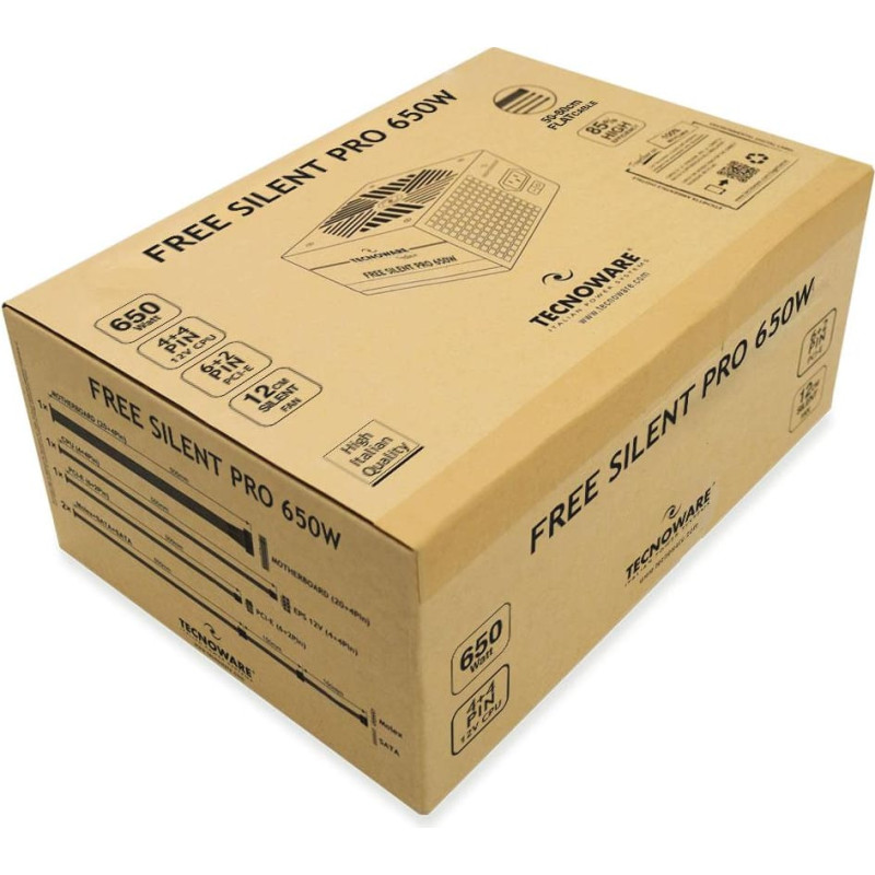 Internal power supply for personal computer, power 650W, input voltage 230 Vac, 50/60 Hz, conforms to ATX 12V v.2.31 specifications, main switch, surge protection, overload protection, short circuit protection, high MTBF, high reliability, quiet operation, 12 cm silent fan, temperature control of fan speed, Flat type connection cables from 500mm to 800mm, 1 x 20+4-pin connector, 1 x 12V 4+4-pin connector, 1 x 6+2 PCI-E connector, 2 x Molex connectors, 4 x Sata connector, dimensions 150x140x86 mm, weight 1.0 Kg, black color, CE certification, RoHS.