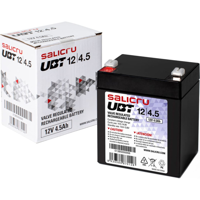 | Salicru's UBT series batteries are extremely powerful and compact rechargeable lead-lead dioxide energy accumulators particularly suitable for UPSs and other security systems that require reliable and high-quality energy back-up. Salicru's UBT battery range includes 4.5 Ah, 7 Ah, 9 Ah, 12 Ah and 17Ah models, all at 12 V. The sulphuric acid electrolyte is absorbed by the separators and plates. And these in turn immobilised. They are designed using gas recombination technology which eliminates the need for the regular addition of water by controlling the evolution of hydrogen and oxygen during charging. The battery is completely sealed and watertight and therefore maintenance free, enabling it to be used in any position. If the battery is accidentally overcharged, resulting in the production of hydrogen and oxygen, a number of special one-way valves allow the gases to escape to avoid interior overpressure. | ||||||||||||||||||||||||||||||||||