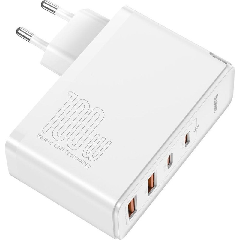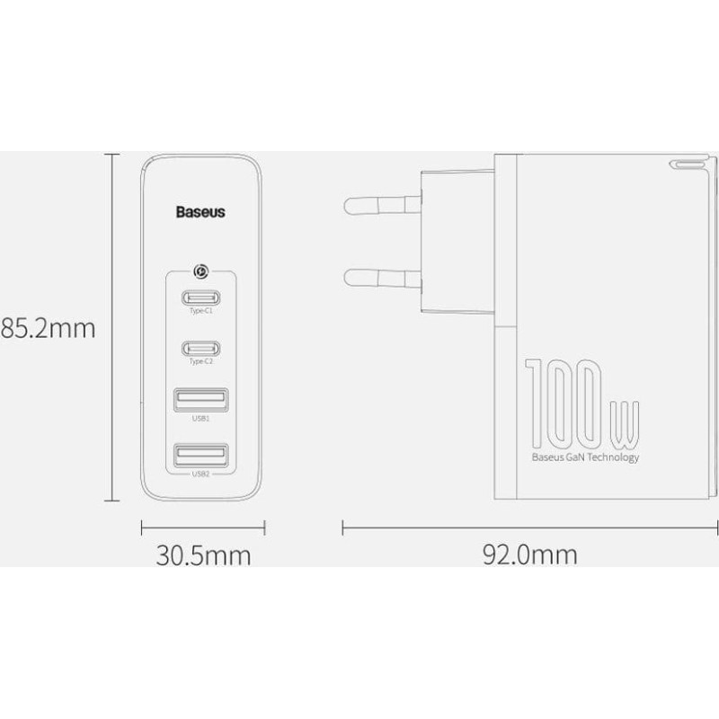 Charge 4 devices simultaneouslyThe new Baseus 4-port charger allows you to quickly charge several devices simultaneously. Using third generation Gan Pro and SiC semiconductors, 100W core power and wide compatibility make you charge up to 4 devices at the same time.