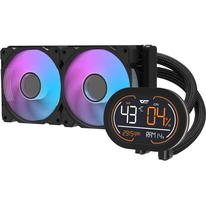 Darkflash DH240D v2 CPU water cooling (black)Darkflash DH240D v2 is an advanced water cooling that combines a modernistic design with maximum performance and quiet operation. Its compatibility with both Intel and AMD platforms makes it an ideal choice for any computer. The integrated segmented LED screen provides a convenient preview of the cooling operation, and with ARGB lighting for ASUS, MSI and GIGABYTE motherboards you will get spectacular visual effects. The water block's copper base effectively dissipates heat, working with a 240mm aluminum heatsink and two powerful PWM fans for both optimal airflow and quiet operation. Bet on the Darkflash DH240D v2 - a reliable cooling that will highlight the character of your PC and allow you to get the most out of it!