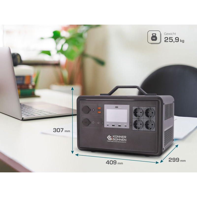 The KS 2400PS Portable Power Station is a high-quality solution providing uninterrupted power both indoors and outdoors. Featuring a LiFePO₄ battery that offers a long lifespan of up to 4000 charge-discharge cycles and the option to recharge from solar panels, this station is perfect for everyday energy supply and outdoor activities.