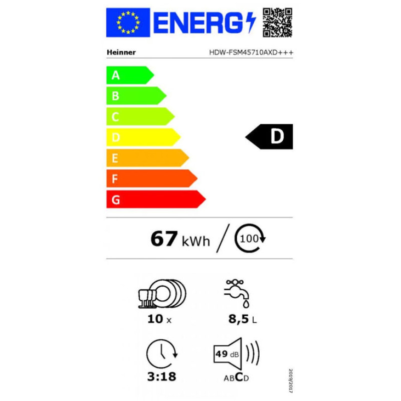 Dishwasher Heinner HDW-FSM45710AXD+++, 10 place settings, energy efficiency class D, Auto door opening, electronic control, LED display, 7 washing programs, Rapid program 30’, Auto Smart program: 55°C - 65°C, 90 min. program, Intensive program: 65°C, delay timer option (1-24H), half load option - Dual zone, Extra cleaning function, Extra drying function, 3 baskets – upper cutlery basket, Flexible space - Adjustable upper basket (loaded), lower basket: 2 foldable plate supports, Child lock, protection against water damage – Aquastop, water consumption: 8.5L/washing cycle, dimensions (WxDxH): : 45 x 60 x 85 cm, color: Inox look door/Silver panel