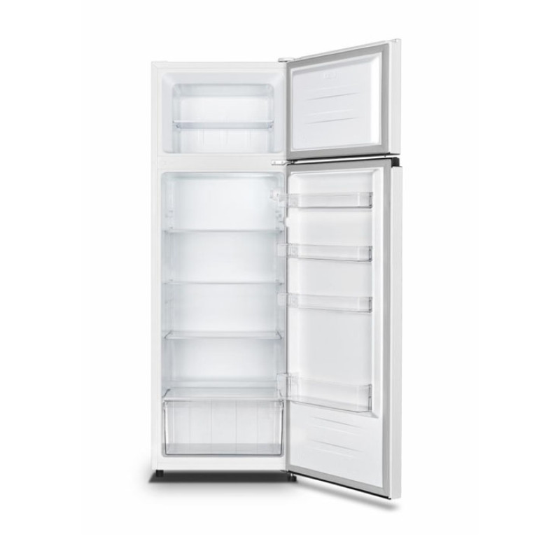 Double door refrigerator Heinner HF-HS243E++, energy efficiency class: E, total capacity: 243L, fridge capacity: 202L, freezer capacity: 41L, mechanical control with adjustable thermostat, LED light, 3 fridge glass shelves, compartment for fruits and vegetables, 3 freezer compartments, reversible doors, egg tray, ice cube tray, freezing capacity: 2 kg/24h, dimensions (WxDxH): 55 x 54.2 x 161 cm, color: White with black handle.