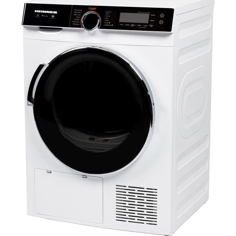 Tumble dryer with heat pump HEINNER HHPD-M9K3A+++, Loading capacity 9 kg, Energy class C, Inverter motor, 14 programs, Touchscreen control, Digital display, Baby care program, Wool program, Sterilization program, Anti-crease function, Program memory, Drum light, Drying level selector, Lint filter cleaning indicator, Full water collection tank indicator, Children lock, Dimensions (D x W x H): 67.5x59.5x84.5 cm, Color: white