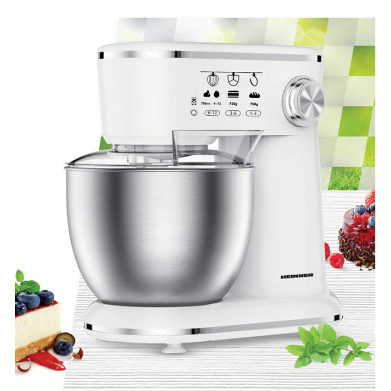 Planetary mixer HEINNER HPM-1000WHCH, Power 1000 W, Stainless steel bowl: 5 L, 10 speeds, Accessories: whisk, dough hook & kneading blade, Transparent splash guard, Color: white.