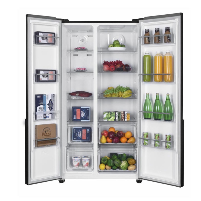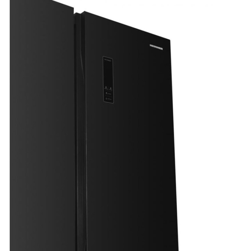 Side by side Heinner HSBS-HM532NFGBKE++, Full No Frost, Inverter compressor, energy efficiency class: E, LED display with touch control, total capacity: 532L, fridge capacity: 347L, freezer capacity: 185L, LED light, Smart function, ECO function, Super Cooling function, Super Freezing function, open door alarm, child lock, 3 fridge glass shelves, 2 compartments for fruits and vegetables, 3 freezer glass shelves, 2 freezer drawers, dimensions (WxDxH): 90 x 66 x 177 cm, color: Black glass>