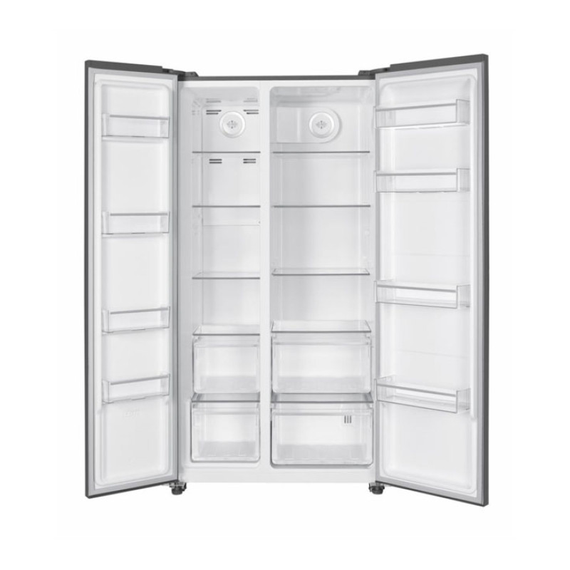 Refrigerator side by side Heinner HSBS-HM532NFGWHE++, Full No Frost,, energy efficiency class: E, Inverter compressor, White Glass doors, LED display with touch control, total capacity: 532L, fridge capacity: 347L, freezer capacity: 185L, LED light, SMART function, ECO Function, Super cooling function, Super freezing function, open door alarm, child lock, 3 fridge glass shelves, 2 compartment for fruits and vegetables , 3 freezer glass shelves, 2 freezer drawers, dimensions (WxDxH): 90 x 66 x 177 cm, color: White glass doors/Grey cabinet.