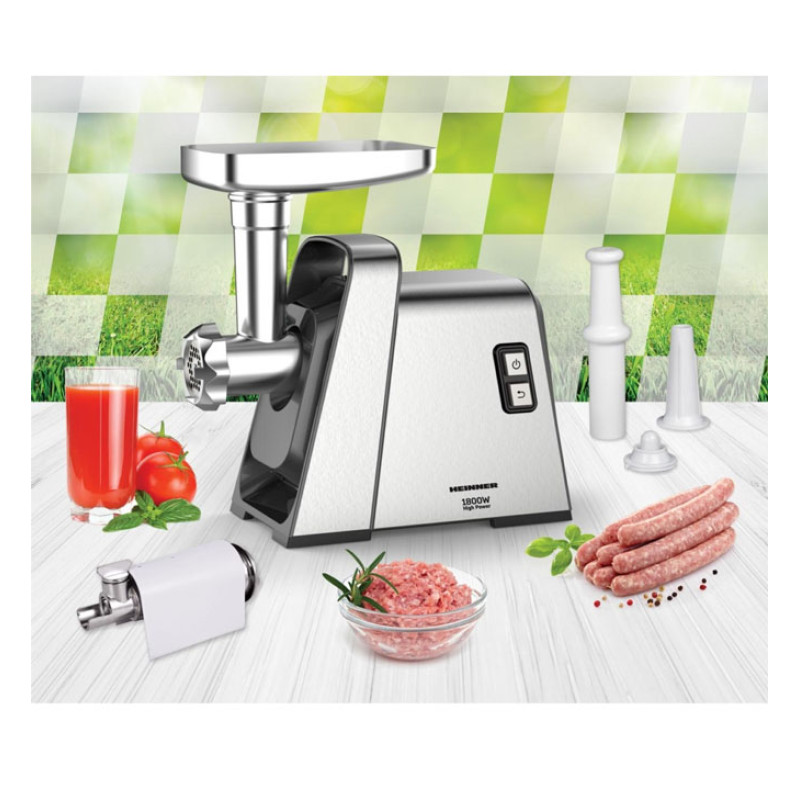 Meat grinder Heinner HighPro 1800 MG-Y1800X, 1800W, tomato and sausage accessory, metal gears, mincing capacity: 2kg/min, stainless steel blade, "reverse" functions, 3 cutting plates, storage space for accessories in the back, stainless steel housing with handle, silver