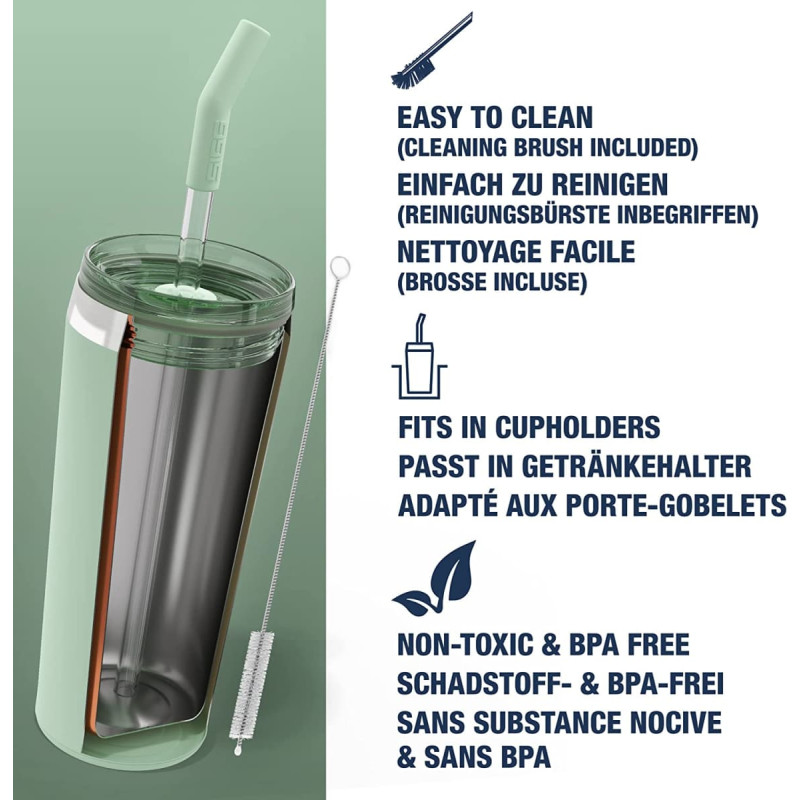 | Every detail of the Helia vacuum-insulated coffee mug in milky green has been designed to make the drinking experience as easy and enjoyable as possible. It is leak-proof, with a removable silicone mouthpiece that ensures the perfect drinking angle and a wide lid that allows the addition of ice cubes or fruit slices. The transparent Tritan cap makes it easy to see when it's time to refill. Made from double-walled 18/8 stainless steel, the Helia coffee mug is ready for any adventure while preserving the aroma of the drink so you don't have to compromise on refreshment on the go. The copper-coated double-wall construction keeps iced tea, cocktails or smoothies at the optimal temperature while ensuring that no condensation forms on the outside of the mug and therefore no puddles on the table. Cold drinks stay chilled for up to 17 hours and hot drinks stay hot for up to 3 hours. The Helia mug comes with a practical, robust glass drinking straw and a matching clEAN Code ing brush, so that disposable drinking straws can be completely dispensed with. Like all SIGG products, it was also designed with a special focus on sustainability and food safety. The Helia "Milky Green" coffee mug is therefore both recyclable and free from harmful chemicals such as BPA and phthalates. The Helia mug can be used for many years, making it an ideal alternative to disposable bottles and cups.Art. no.: 1905256 Type Thermo Mug Color light green EAN Code 7630135601518 Manufacturer part number: 6015,10 Made in China Helia series Number of parts 4 -piece Consists of cup, lid, drinking straw, silicone mouthpiece Area of application: kitchen, school or office/workplace Material: stainless steel Size Capacity 450 ml Notes BPA-free Feature Cold drinks stay chilled for 17 hours and hot drinks stay warm for up to 3 hours Accessories available ClEAN Code ing brush Dimensions Width: 88 mm x Height: 255 mm Weight 290 grams | ||||||||