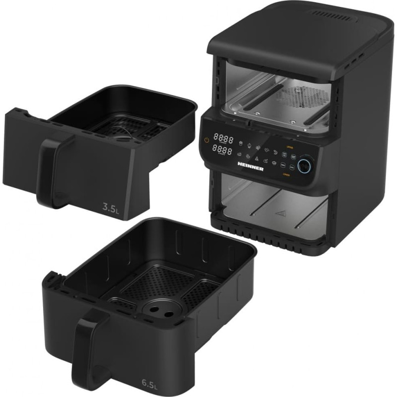 Heinner HAF-C10DBS25BK is a powerful dual-layer air fryer with independent baskets and Smart + Dual Cooking functions. With a total 10 L capacity and 2500 W power, it ensures fast, even cooking using 360° hot air circulation.
