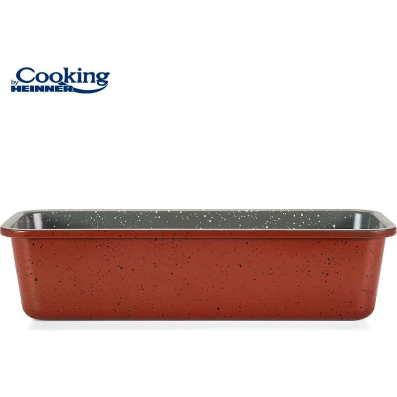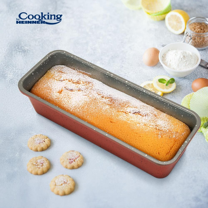 Ceramic-coated loaf baking pan made of carbon steel, suitable for baking bread and cakes. Features a durable two-layer marble-effect ceramic interior and a high-temperature resistant red exterior coating for reliable everyday baking.