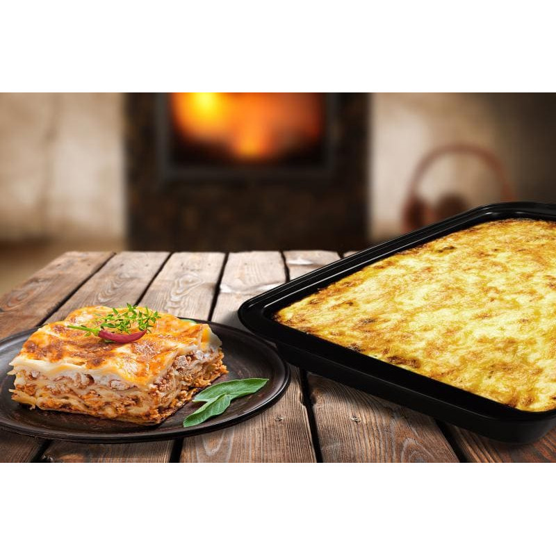Rectangular non-stick oven tray made of carbon steel, suitable for baking and roasting. Provides even heat distribution, durability, and easy cleaning for everyday oven use.