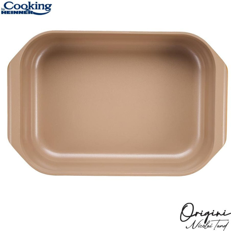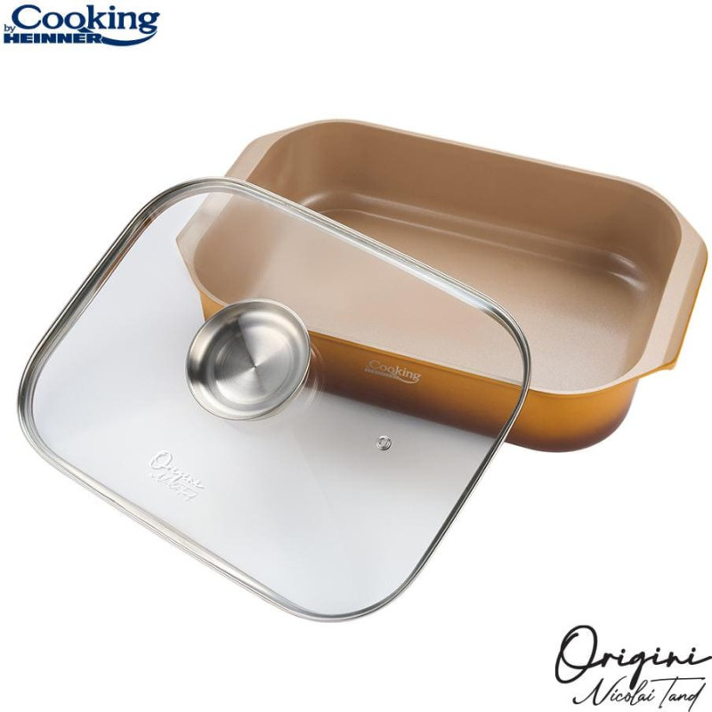 High cast aluminum oven tray with lid, designed for roasting and baking with uniform heat distribution. The grey non-stick ceramic interior allows healthier cooking with less fat, while the durable exterior coating withstands high temperatures. Ideal for everyday oven and hob use.