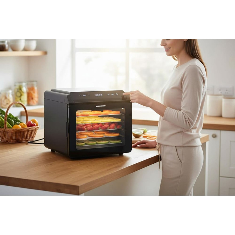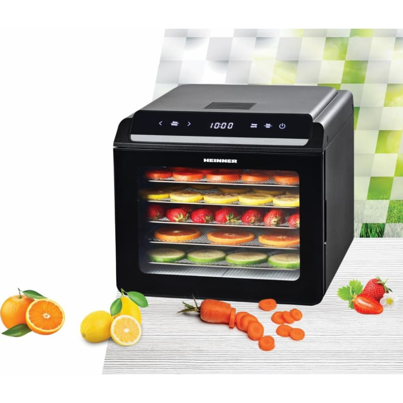 Heinner HFD-KD600BK food dehydrator with 600 W power is ideal for drying fruits, vegetables, herbs, and more. Equipped with LED display and touch control, it offers adjustable temperature and timer for precise and convenient operation.