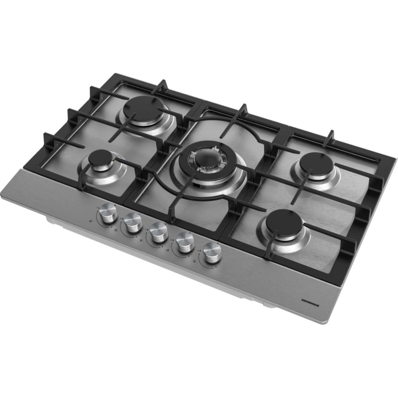 The built-in gas hob Heinner HBH-M705IWFIX is a modern and powerful choice for any kitchen. It operates on gas and features 5 burners, including a Wok burner ideal for cooking in larger pots and pans. The cast iron grates ensure excellent stability and durability, while the electric ignition allows for convenient and quick operation. The safety device protects against gas leaks, ensuring safe use. Measuring 52x75 cm, the stainless steel surface gives your kitchen a sleek and professional look.