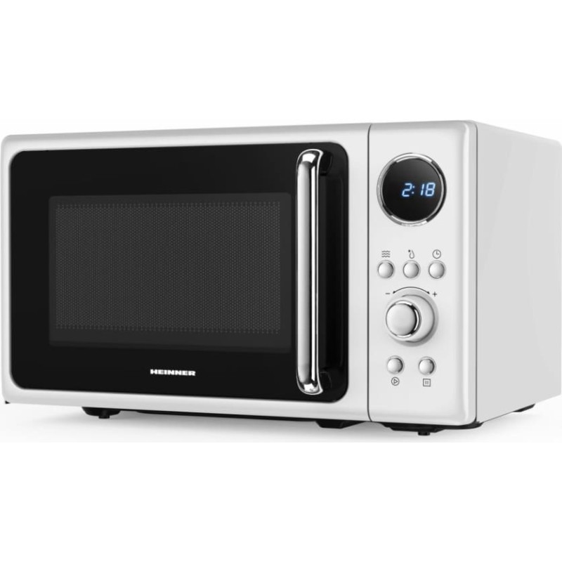Heinner HMW-MD20DRWH is a 20 L microwave oven with digital display and 800 W output power. It features 5 power levels, defrost cooking program, and 95-minute timer, finished in white design.