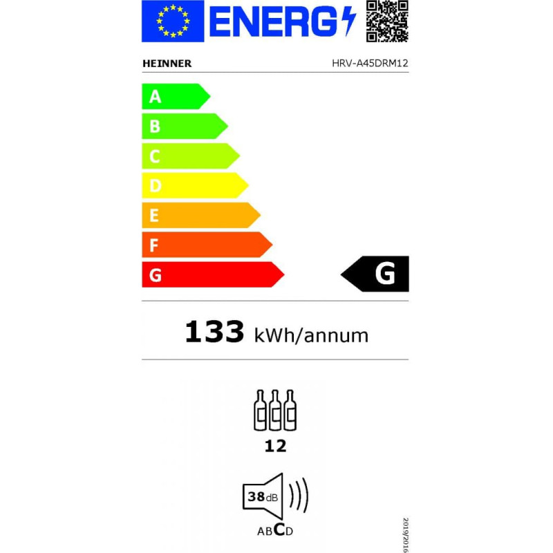 Heinner HRV-A45DRM12 is a compact single-zone wine cooler designed to store up to 12 bottles. It features electronic control with LED display, adjustable temperature range, interior LED lighting, and a reversible door in an elegant black design.