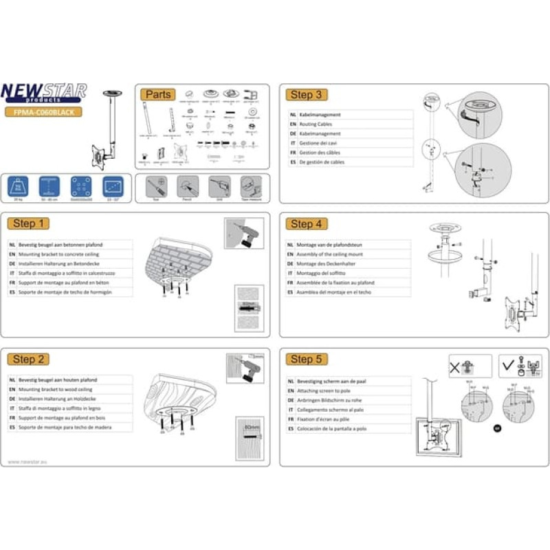 | The NewStar ceiling mount, model FPMA-C060BLACK is a tilt- and swivel ceiling mount for flat screens up to 40”. This mount is a great choice for space saving placement or when wall mounting and floor placement is not an option. NewStars’ unique tilt (40°) and swivel (180°) technology allows the mount to change to any viewing angle to fully benefit from the capabilities of the flat screen. The support is easily height adjustable from 50 to 85 centimeters. A unique cable management conceals and routes cables from ceiling to TV. Hide your cables in the column to keep it nice and tidy. NewStar FPMA-C060BLACK has two pivot points and is suitable for screens up to 40" (100 cm). The weight capacity of this product is 20 kg. The ceiling mount is suitable for screens that meet VESA hole pattern 50x50 or 200x200mm. Different hole patterns can be covered using NewStar VESA adapter plates. - Screens: 1 - VESA minimum: 50x50 mm - VESA maximum: 200x200 mm - Tilt: 40° - Swivel: 180° - Depth: 13cm - Height: 50-85cm Manufacturer Website: http://en.newstar.eu/av-mounts/flat-screen-mounts/ceiling-mounts/newstar-flat-screen-ceiling-mount-14/ | ||||||||||||||||||||||||||||||||
